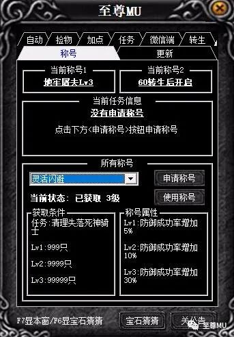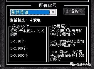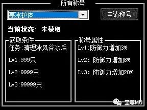 至尊奇迹独家称号系统,完成任务获得称号,提升角色属性。MU私服称号是展示实力的荣誉象征。